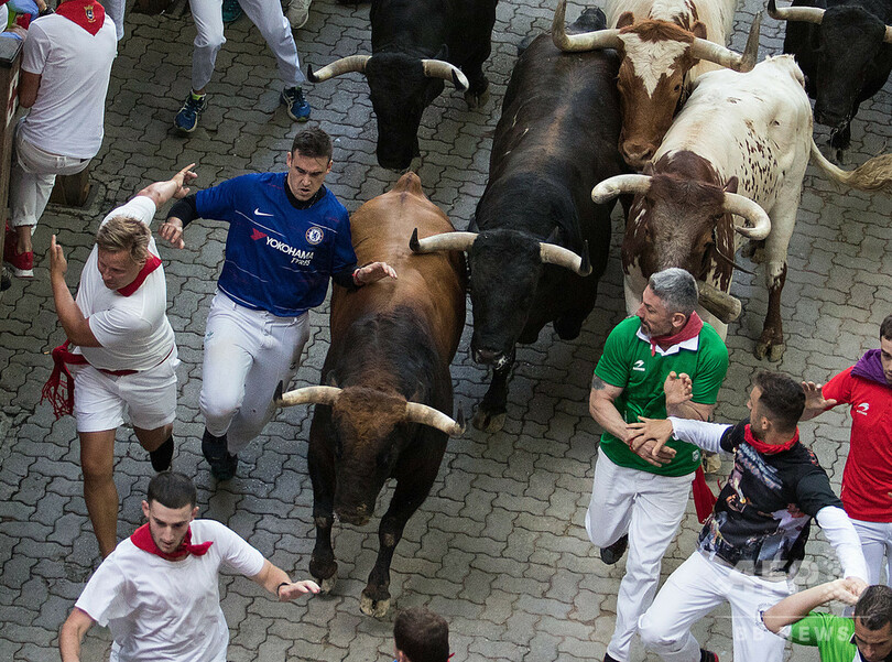 何世紀にもわたって開かれ、毎年100万人以上の人出があるこの祭りでは、7月6~14日の期間中毎朝、体重500キロの闘牛が、伝統の白いシャツと赤いスカーフを着用して街の狭い路地を駆け抜ける命知らずの参加者らを追い掛ける。(c)AFP