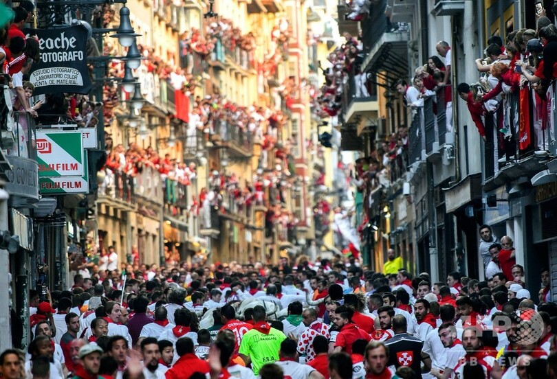 何世紀にもわたって開かれ、毎年100万人以上の人出があるこの祭りでは、7月6~14日の期間中毎朝、体重500キロの闘牛が、伝統の白いシャツと赤いスカーフを着用して街の狭い路地を駆け抜ける命知らずの参加者らを追い掛ける。(c)AFP