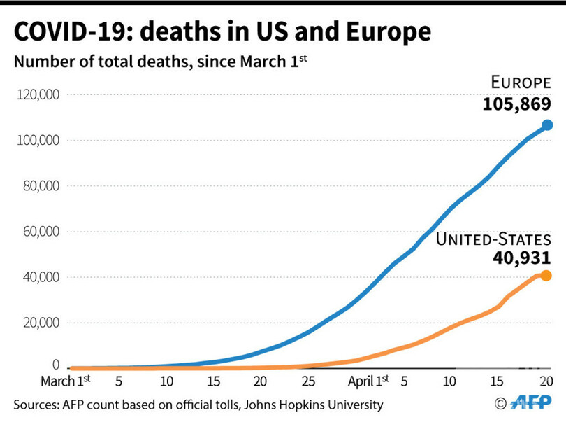 地域別の死者数は、欧州が10万9381人(感染123万4340人)、米国・カナダが4万4982人(感染84万1584人)、アジアが7191人(感染17万4020人)、中東が5784人(感染13万3221人)、中南米・カリブ海(Caribbean Sea)諸国が5377人(感染10万9739人)、アフリカが1195人(感染2万4409人)、オセアニアが91人(感染7927人)となっている。(c)AFP