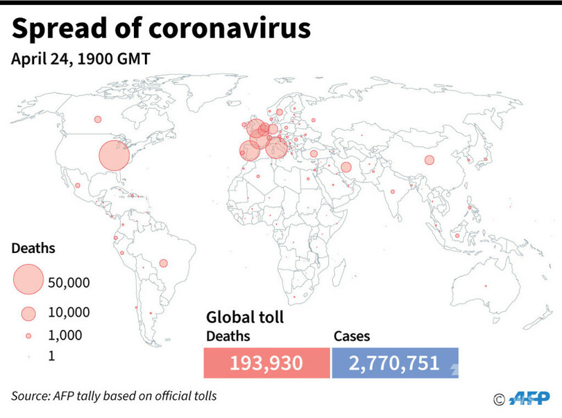 【4月25日 AFP】AFPが各国当局の発表に基づき日本時間25日午前4時にまとめた統計によると、世界の新型コロナウイルスによる死者数は19万3930人に増加した。