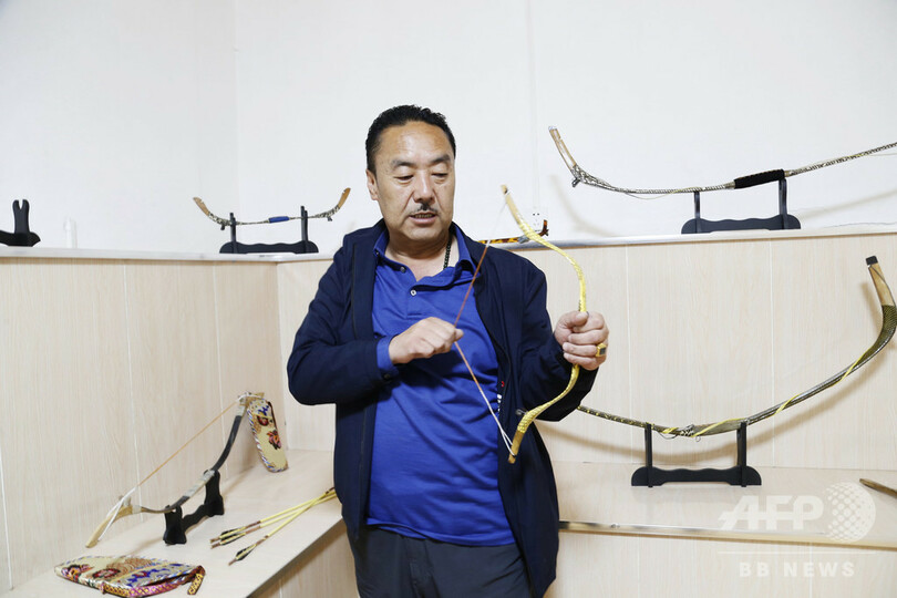 オソンドジェさんは弟子を率いて、水牛の角の切断や磨く工程、竹の加工、絵図の描き込みの工程などを通し、完全手作業によるチベット伝統の「牛角弓」を作り出す。工房内には、射場も備えられている。(c)CNS/JCM/AFPBB News