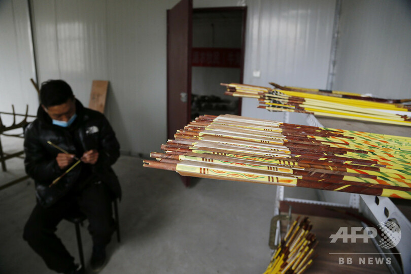 オソンドジェさんは弟子を率いて、水牛の角の切断や磨く工程、竹の加工、絵図の描き込みの工程などを通し、完全手作業によるチベット伝統の「牛角弓」を作り出す。工房内には、射場も備えられている。(c)CNS/JCM/AFPBB News