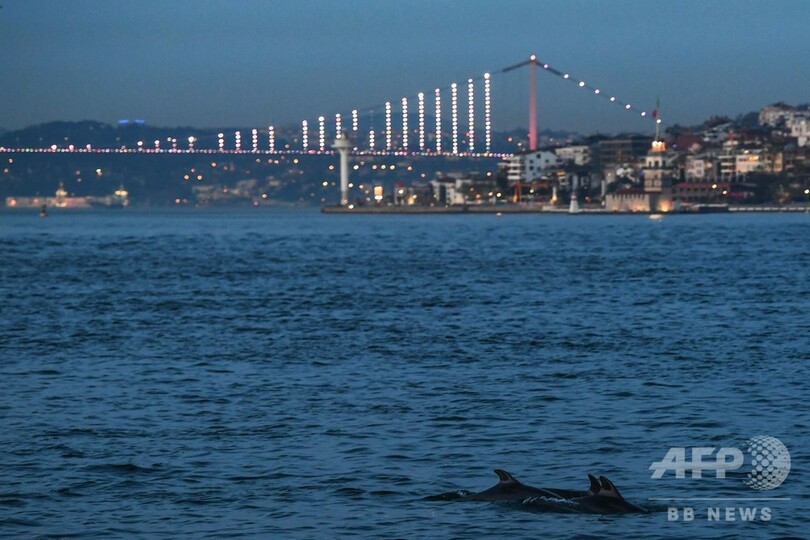 【4月27日 AFP】新型コロナウイルスのパンデミック(世界的な大流行)により船の運航と漁業が止まったトルコのイスタンブールでは、欧州とアジアを隔てるボスポラス海峡(Bosphorus Strait)の海の幸の豊かな水域を人気者のイルカが泳ぎ回っている。