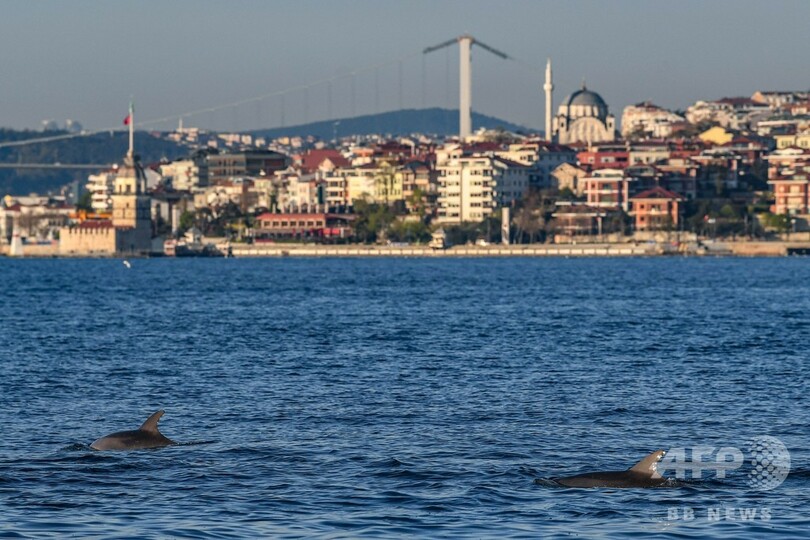 【4月27日 AFP】新型コロナウイルスのパンデミック(世界的な大流行)により船の運航と漁業が止まったトルコのイスタンブールでは、欧州とアジアを隔てるボスポラス海峡(Bosphorus Strait)の海の幸の豊かな水域を人気者のイルカが泳ぎ回っている。