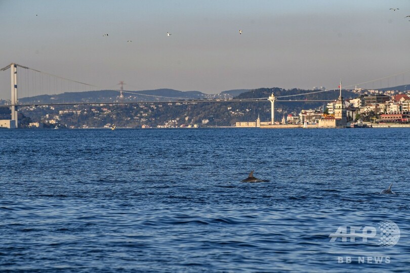 【4月27日 AFP】新型コロナウイルスのパンデミック(世界的な大流行)により船の運航と漁業が止まったトルコのイスタンブールでは、欧州とアジアを隔てるボスポラス海峡(Bosphorus Strait)の海の幸の豊かな水域を人気者のイルカが泳ぎ回っている。