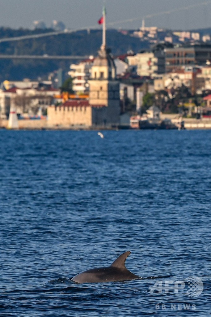 【4月27日 AFP】新型コロナウイルスのパンデミック(世界的な大流行)により船の運航と漁業が止まったトルコのイスタンブールでは、欧州とアジアを隔てるボスポラス海峡(Bosphorus Strait)の海の幸の豊かな水域を人気者のイルカが泳ぎ回っている。