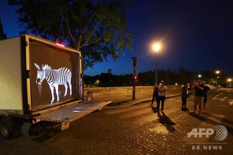 【5月5日 AFP】フランス・パリで、トラックから流される音楽にあわせて通りに照射された動物のホログラム。アレキサンドル・ザネッティ(Alexandre Zanetti)氏が手掛けた。