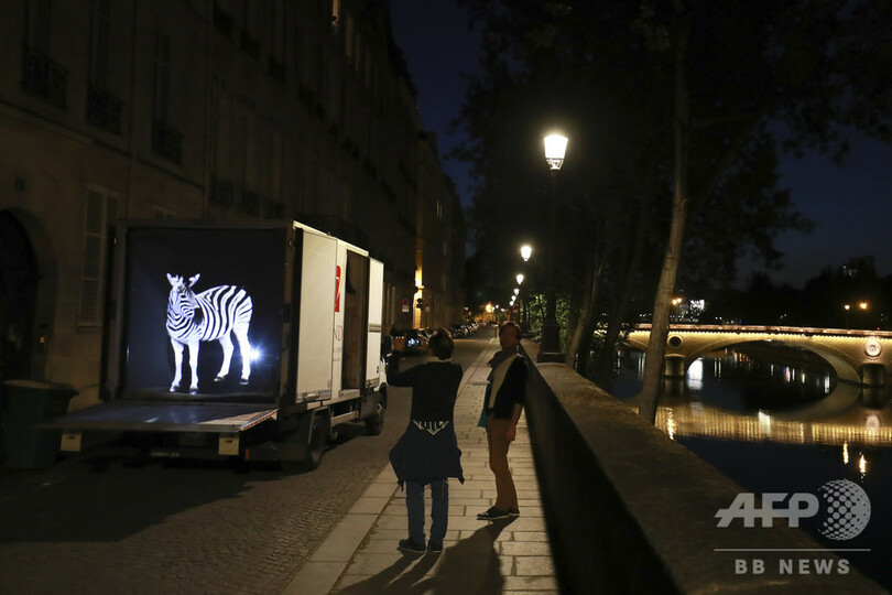 【5月5日 AFP】フランス・パリで、トラックから流される音楽にあわせて通りに照射された動物のホログラム。アレキサンドル・ザネッティ(Alexandre Zanetti)氏が手掛けた。
