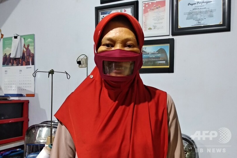 2人は4月に入って以降、大・中・小のサイズの透明マスクを1日に20枚ほど生産しており、1枚1万〜1万5000ルピア(約70〜100円)で販売している。(c)AFP