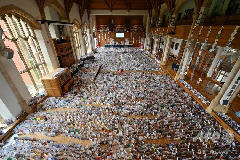 【5月6日 AFP】英ロンドン北部ベッドフォード(Bedford)の学校の講堂に置かれた退役軍人トム・ムーア(Tom Moore)さんの100歳の誕生日を祝って送られた12万5000枚以上のカード。学校は、新型コロナウイルス感染流行のため閉鎖されている。