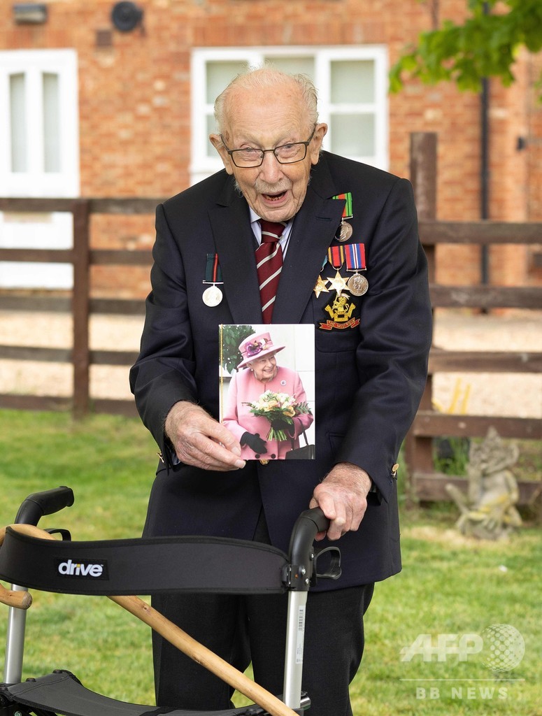 第2次世界大戦(World War II)で従軍したムーアさんは今月、国民保健サービス(NHS)の医療従事者やボランティアらのために寄付を募ろうと、自宅の庭を歩行器を使って100回歩くことに挑戦。