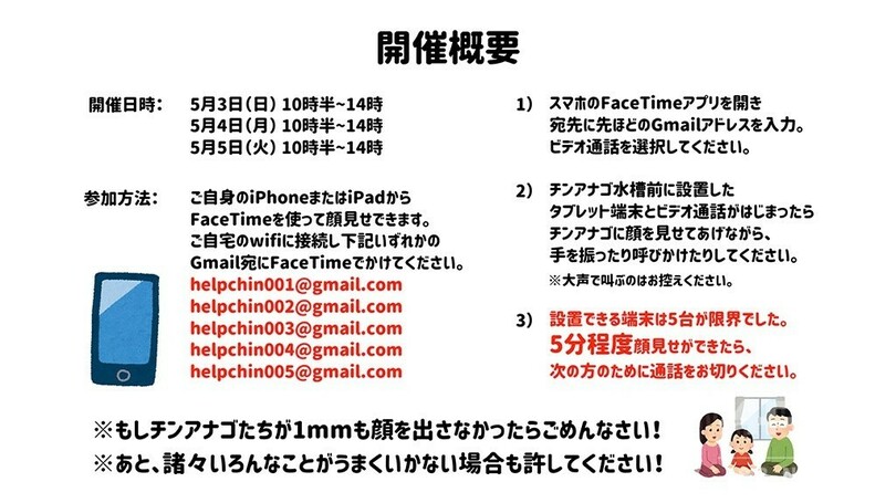 同館は「だから緊急のお願いです。ご自宅から、うちのチンアナゴたちにあなたの顔を見せてあげてくれませんか?」と呼び掛け、「チンアナゴ顔見せ祭り」と称したイベントの開催を発表した。