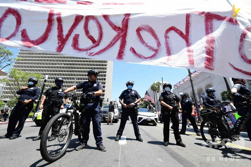 ロサンゼルス市内では、数百人が市役所の前で外出制限の終了を求めるデモ行進を行い、カウンターデモの参加者らがロックダウン(都市封鎖)は人命を救うには必要な措置だと訴え、緊迫した空気が漂った。