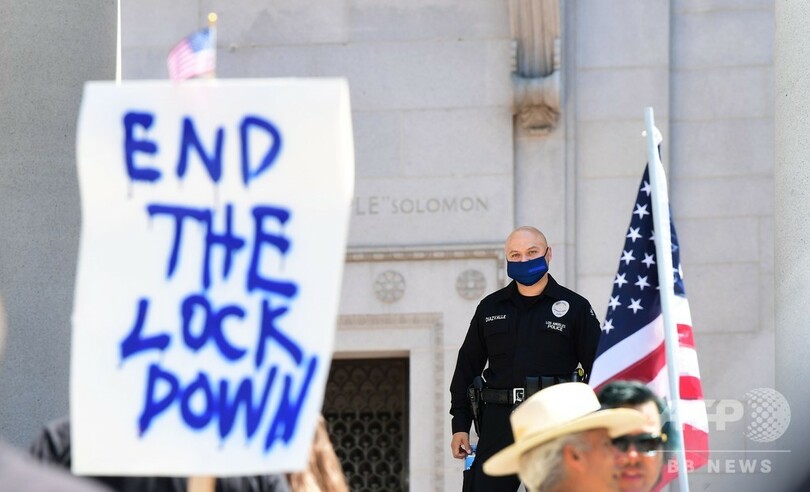 ロサンゼルス市内では、数百人が市役所の前で外出制限の終了を求めるデモ行進を行い、カウンターデモの参加者らがロックダウン(都市封鎖)は人命を救うには必要な措置だと訴え、緊迫した空気が漂った。