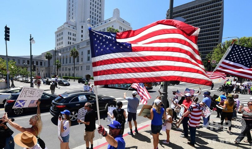 ロサンゼルス市内では、数百人が市役所の前で外出制限の終了を求めるデモ行進を行い、カウンターデモの参加者らがロックダウン(都市封鎖)は人命を救うには必要な措置だと訴え、緊迫した空気が漂った。