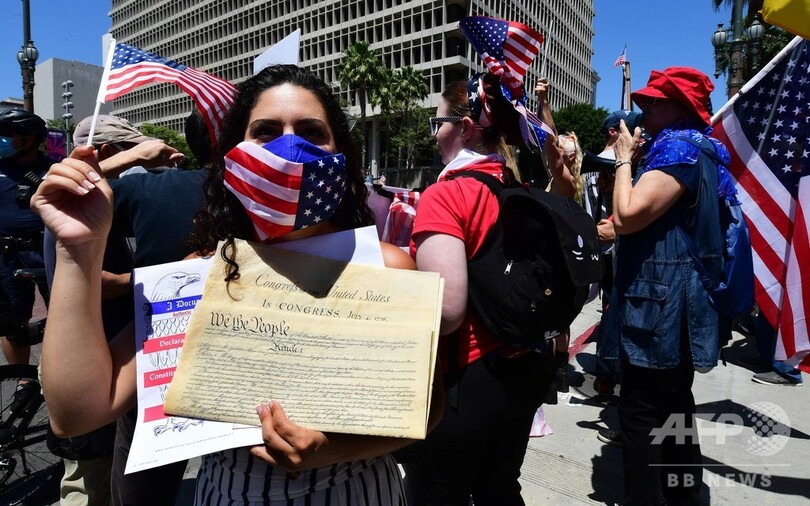 ロサンゼルス市内では、数百人が市役所の前で外出制限の終了を求めるデモ行進を行い、カウンターデモの参加者らがロックダウン(都市封鎖)は人命を救うには必要な措置だと訴え、緊迫した空気が漂った。