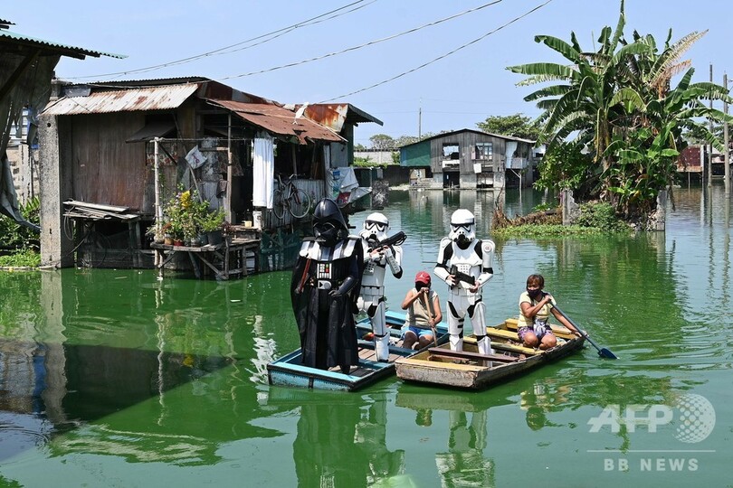 【5月16日 AFP】フィリピン・マニラ郊外で、映画「スター・ウォーズ(Star Wars)」シリーズのダース・ベイダー(Darth Vader)とストームトルーパーに扮(ふん)し、水上を木製のボートでパトロールする地元の若者グループ。