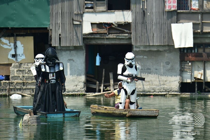 【5月16日 AFP】フィリピン・マニラ郊外で、映画「スター・ウォーズ(Star Wars)」シリーズのダース・ベイダー(Darth Vader)とストームトルーパーに扮(ふん)し、水上を木製のボートでパトロールする地元の若者グループ。