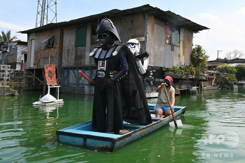 【5月16日 AFP】フィリピン・マニラ郊外で、映画「スター・ウォーズ(Star Wars)」シリーズのダース・ベイダー(Darth Vader)とストームトルーパーに扮(ふん)し、水上を木製のボートでパトロールする地元の若者グループ。