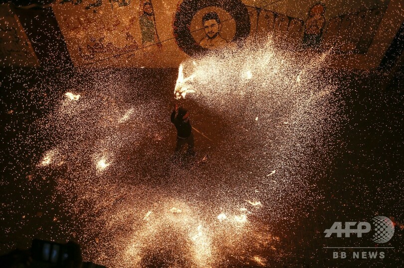 【5月12日 AFP】パレスチナ自治区ガザ地区(Gaza Strip)南部ラファ(Rafah)にある難民キャンプで、イスラム教の断食月「ラマダン(Ramadan)」の夜を祝い、手作りの線香花火を振り回す若者。(c)AFP