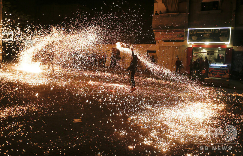 【5月12日 AFP】パレスチナ自治区ガザ地区(Gaza Strip)南部ラファ(Rafah)にある難民キャンプで、イスラム教の断食月「ラマダン(Ramadan)」の夜を祝い、手作りの線香花火を振り回す若者。(c)AFP