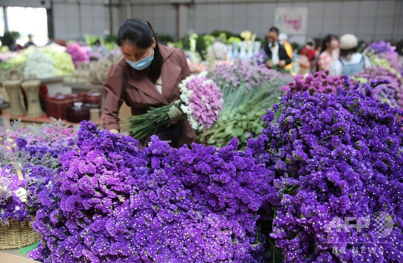 「メーデー」休暇期間中、ここの生花市場の仕事は特に忙しくなる。多くの市民や観光客がここを訪れ、新鮮で鮮やかな生花を楽しみ、競って購入するのだ。休日の生花ビジネスはとりわけ活気づいている。(c)CNS/JCM/AFPBB News