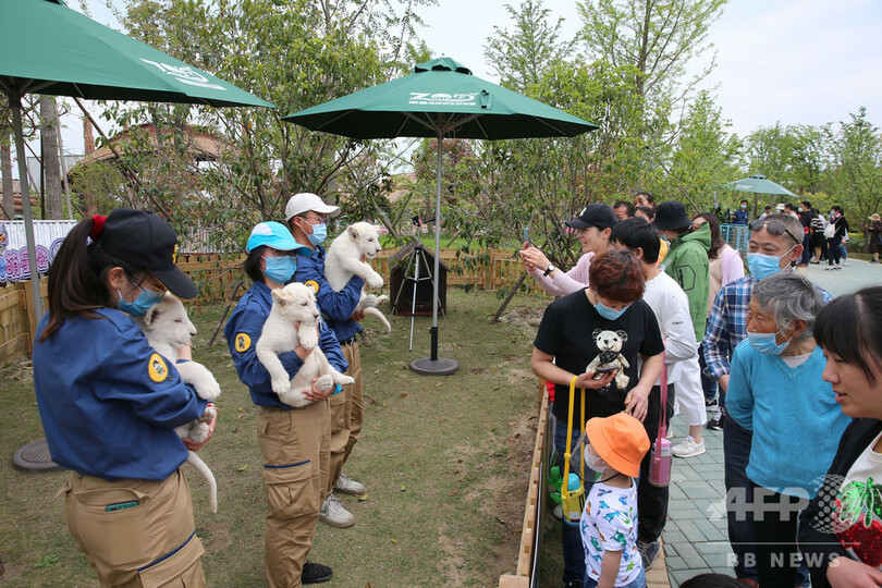 三つ子のホワイトライオンが観客に顔見世 中国・江蘇省