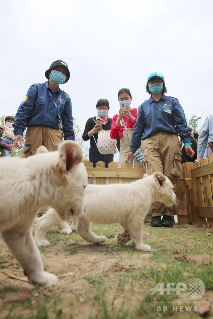 三つ子のホワイトライオンが観客に顔見世 中国・江蘇省