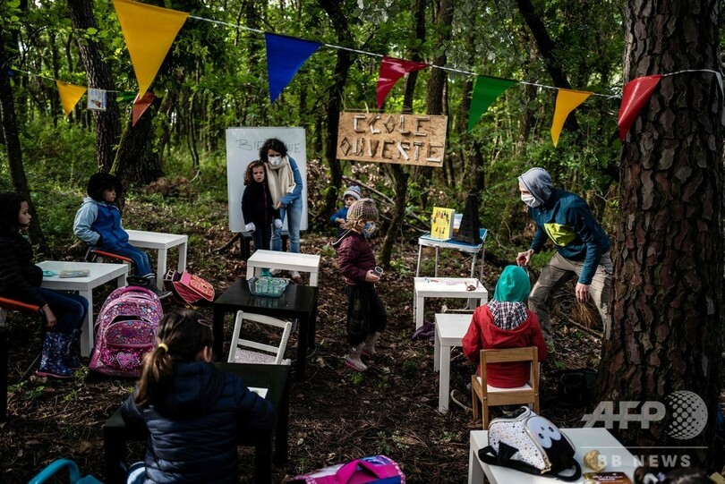 【5月21日 AFP】仏南東部の森では、カシやマツの間に設置された黒板が子どもたちの到着を待つ──ドローム(Drome)県のある村では、学校が再開されないことに抗議するため、保護者らがこのほど、子どもたちを連れて森での授業を始めた。