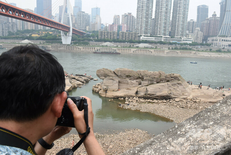 【5月16日 CNS】中国・重慶市(Chongqing)で12日、長江の水流が減り、重慶の東水門長江大橋下流に「竜門皓月(Longmen Haoyue)」と呼ばれる大きな石の梁が水面から大きく姿を現し、市民の目を楽しませていた。