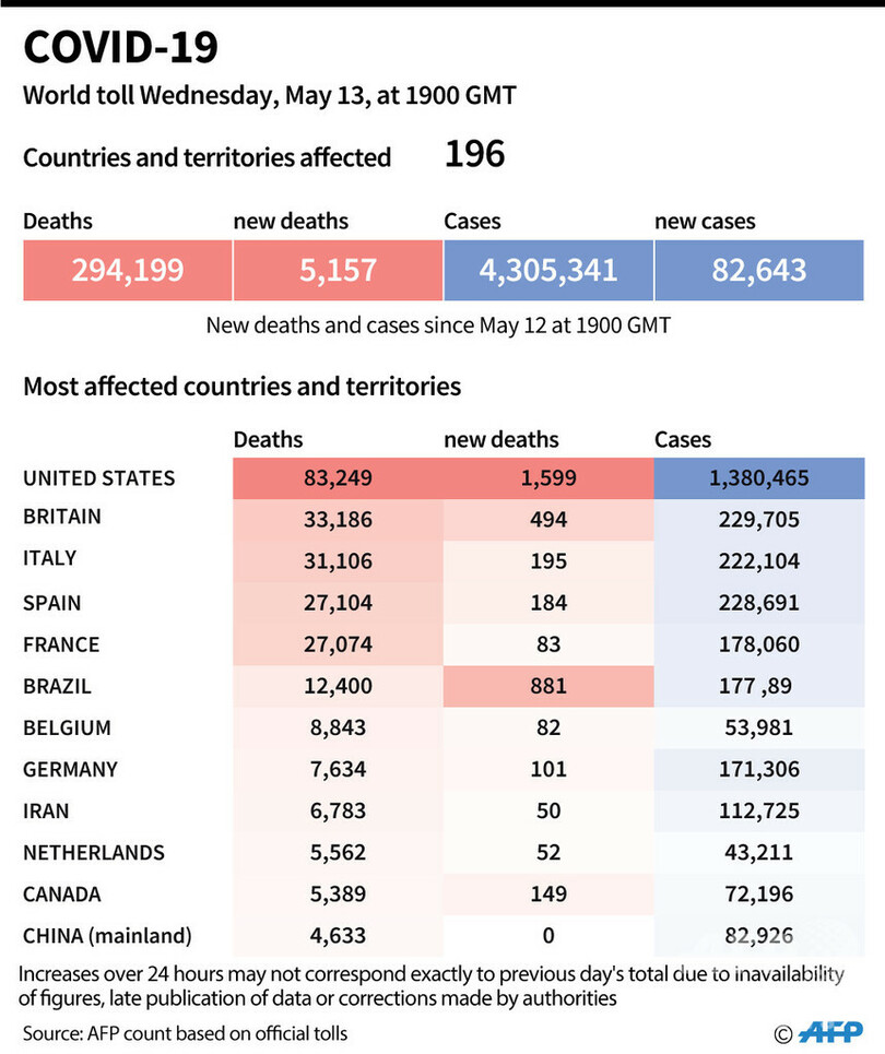 【5月14日 AFP】AFPが各国当局の発表に基づき日本時間14日午前4時にまとめた統計によると、世界の新型コロナウイルスによる死者数は29万4199人に増加した。