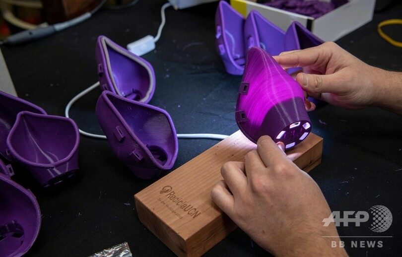 【5月19日 AFP】チリ・サンティアゴの印刷工場でつくられた、銅を含んだフィルター付きの3Dマスク。新型コロナウイルスの感染防止のため、バクテリア、ウイルス、真菌を寄せ付けないなどの効果がある銅のナノ粒子を用いたという。(c)AFP