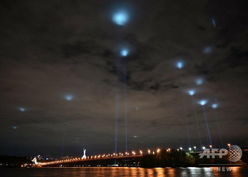 【5月20日 AFP】ウクライナ・キエフで行われた「文化の隔離を止めよう(Stop Cultural Quarantine)」というライトアップによる抗議活動で、夜空に照らし出された「祖国の母(Motherland)の像」。