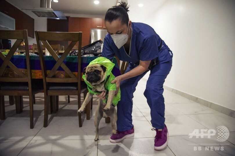【5月31日 AFP】メキシコ・メキシコ市の病院では、新型コロナウイルスと闘う医療従事者らのストレスを和らげるため、セラピー犬の「ハーリー(3歳)」が奮闘中だ。片目の不自由なハーリーは、小さな黄色のブーツにゴーグルと防護服を着用し、毎日2時間、医療従事者らを楽しませるために大忙しだという。