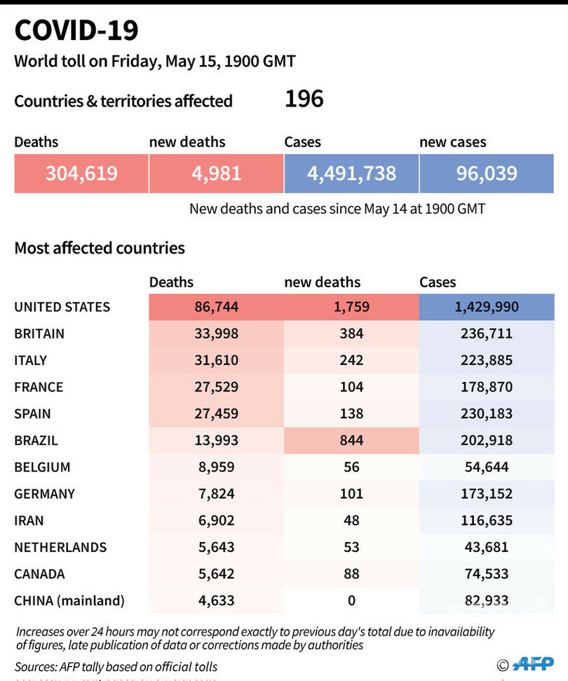 【5月16日 AFP】AFPが各国当局の発表に基づき日本時間16日午前4時にまとめた統計によると、世界の新型コロナウイルスによる死者数は30万4619人に増加した。
