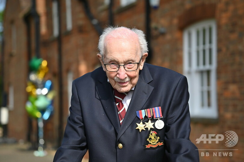 第2次世界大戦(World War II)で従軍した「トム大尉(Captain Tom)」ことムーアさんは先月、国民保健サービス(NHS)の医療従事者やボランティアらのために寄付を募ろうと、自宅の庭を歩行器を使って100周(1周25メートル)することに挑戦。