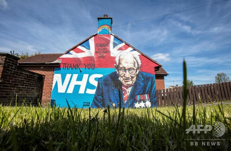 第2次世界大戦(World War II)で従軍した「トム大尉(Captain Tom)」ことムーアさんは先月、国民保健サービス(NHS)の医療従事者やボランティアらのために寄付を募ろうと、自宅の庭を歩行器を使って100周(1周25メートル)することに挑戦。
