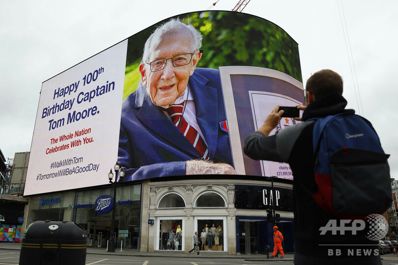 第2次世界大戦(World War II)で従軍した「トム大尉(Captain Tom)」ことムーアさんは先月、国民保健サービス(NHS)の医療従事者やボランティアらのために寄付を募ろうと、自宅の庭を歩行器を使って100周(1周25メートル)することに挑戦。