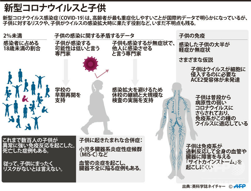 【5月20日 AFP】新型コロナウイルス感染症(COVID-19)は、高齢者が最も重症化しやすいことが国際的データで明らかになっているが、子供に対するリスクや、子供がウイルスの感染拡大時に果たす役割など、いまだ不明点も残る。新型コロナウイルスと子供にまつわる状況を図解にまとめた。