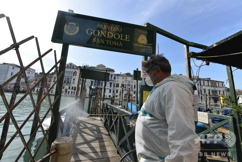 一方、これまで観光客を乗せていた華やかな装飾が施されたゴンドラの運航は、欧州連合(EU)内からの観光客の受け入れを再開する6月3日になる予定。(c)AFP