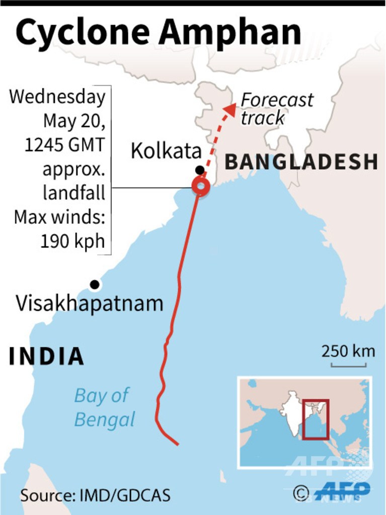 【5月20日 AFP】(図解追加)インド東部に20日夜、近年最強級のサイクロン「アンファン(Amphan)」が上陸した。同国と隣国バングラデシュでは住民数百万人が避難し、祈りをささげた。アンファンは最大瞬間風速約53メートルという猛烈な風を伴っており、広範囲に被害が出る恐れが懸念されている。