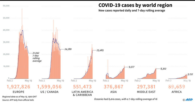 地域別の死者数は、欧州が16万9674人(感染194万4258人)、米国・カナダが9万8674人(感染161万9714人)、中南米・カリブ海(Caribbean Sea)諸国が3万2422人(感染58万3045人)、アジアが1万2941人(感染38万7127人)、中東が8420人(感染30万6715人)、アフリカが2973人(感染9万3772人)、オセアニアが128人(感染8426人)となっている。