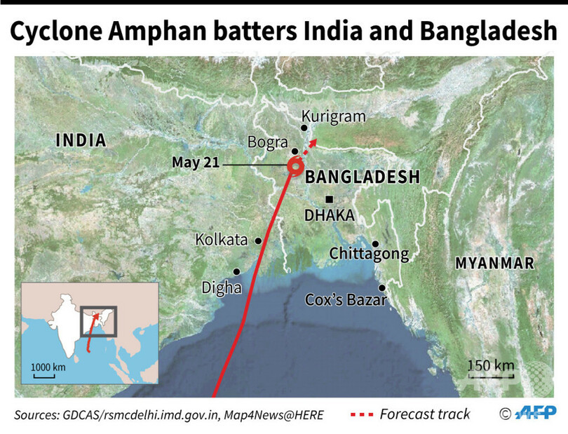 【5月21日 AFP】(更新、図解追加)今世紀最強のスーパーサイクロン「アンファン(Amphan)」の直撃を受けたバングラデシュとインド東部で、21日夜までに84人の死亡が確認された。当局が発表した。ある当局者は、「ここまでの規模の災害は見たことがない」と話している。