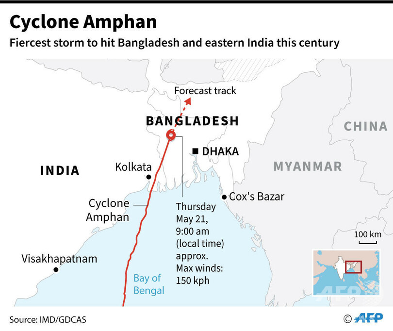 【5月21日 AFP】(更新、図解追加)今世紀最強のスーパーサイクロン「アンファン(Amphan)」の直撃を受けたバングラデシュとインド東部で、21日夜までに84人の死亡が確認された。当局が発表した。ある当局者は、「ここまでの規模の災害は見たことがない」と話している。