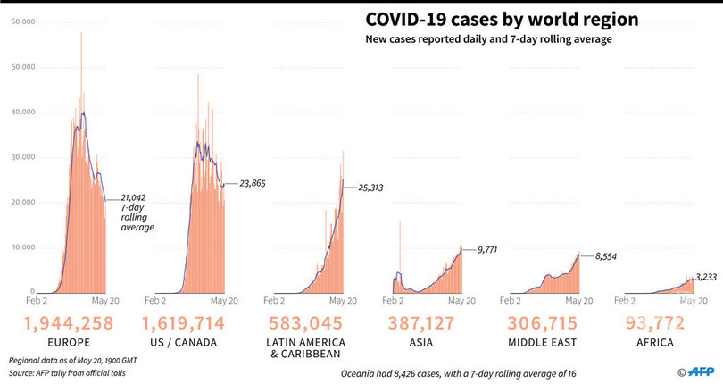 地域別の死者数は、欧州が17万776人(感染196万3531人)、米国・カナダが10万87人(感染164万3991人)、中南米・カリブ海(Caribbean Sea)諸国が3万4049人(感染61万7811人)、アジアが1万3183人(感染40万1458人)、中東が8519人(感染31万5935人)、アフリカが3057人(感染9万8237人)、オセアニアが128人(感染8435人)となっている。