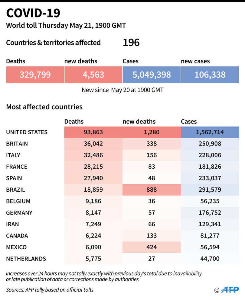 【5月22日 AFP】AFPが各国当局の発表に基づき日本時間22日午前4時にまとめた統計によると、世界の新型コロナウイルスによる死者数は32万9799人に増加した。