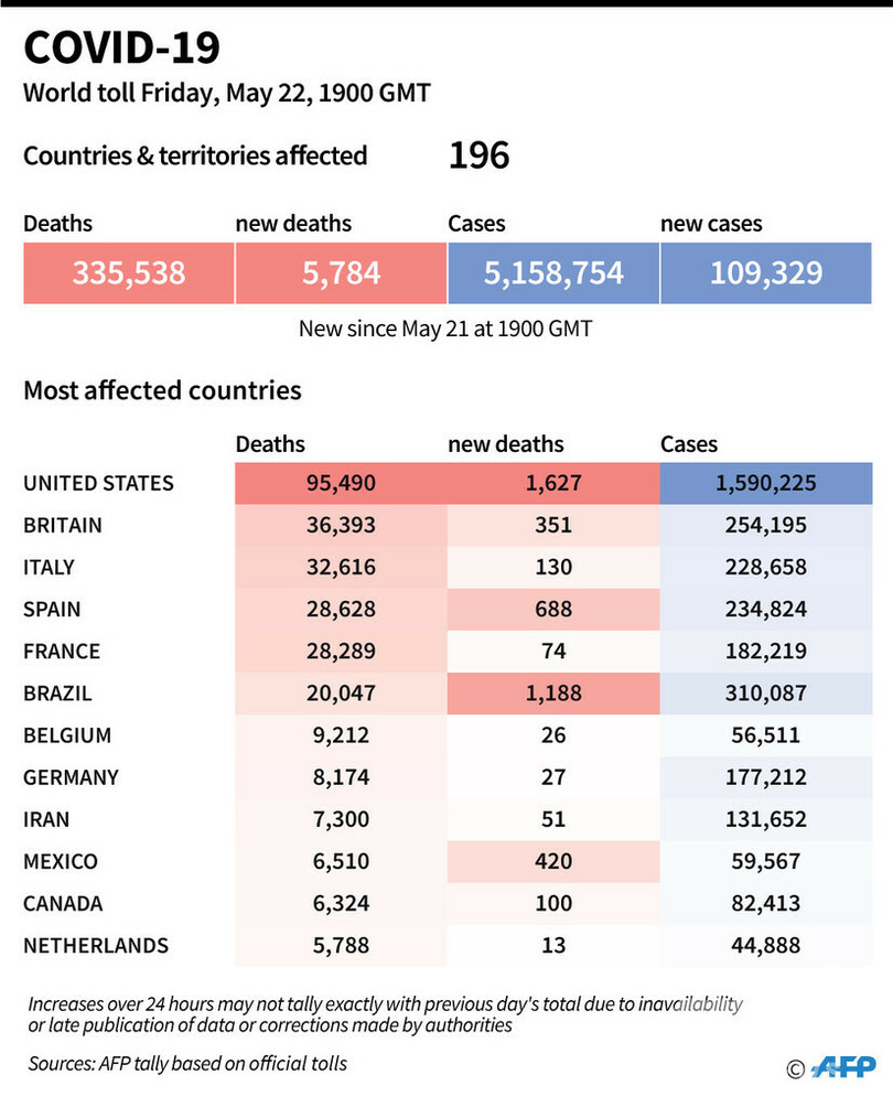 【5月23日 AFP】AFPが各国当局の発表に基づき日本時間23日午前4時にまとめた統計によると、世界の新型コロナウイルスによる死者数は33万5538人に増加した。