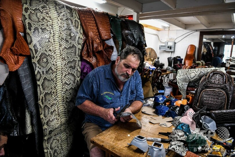 爬虫(はちゅう)類の革を使ってマスクを製作しているのは、「オール・アメリカン・ゲーター・プロダクツ(All American Gator Products)」を経営するブライアン・ウッズ(Brian Woods)氏(63)。マイアミの北40キロに位置するダニアビーチ(Dania Beach)の作業場でウッズ氏は、「非常に深刻な問題をファッションで表現した」と話した。