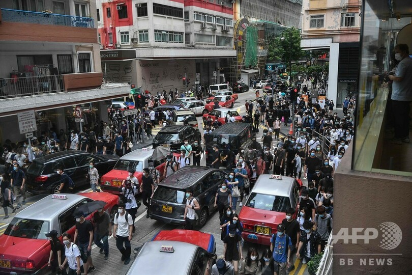 香港が大切にしてきた自由に終止符を打つ法案だとして民主派が警鐘を鳴らす中、繁華街の銅鑼湾(Causeway Bay)と湾仔(Wan Chai)に大勢の人々が集結し、スローガンを叫んだ。一部のデモ参加者はマスクを着用し、警察車両を阻止しようと仮設のバリケードを設置した。