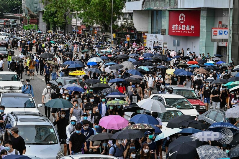 香港が大切にしてきた自由に終止符を打つ法案だとして民主派が警鐘を鳴らす中、繁華街の銅鑼湾(Causeway Bay)と湾仔(Wan Chai)に大勢の人々が集結し、スローガンを叫んだ。一部のデモ参加者はマスクを着用し、警察車両を阻止しようと仮設のバリケードを設置した。
